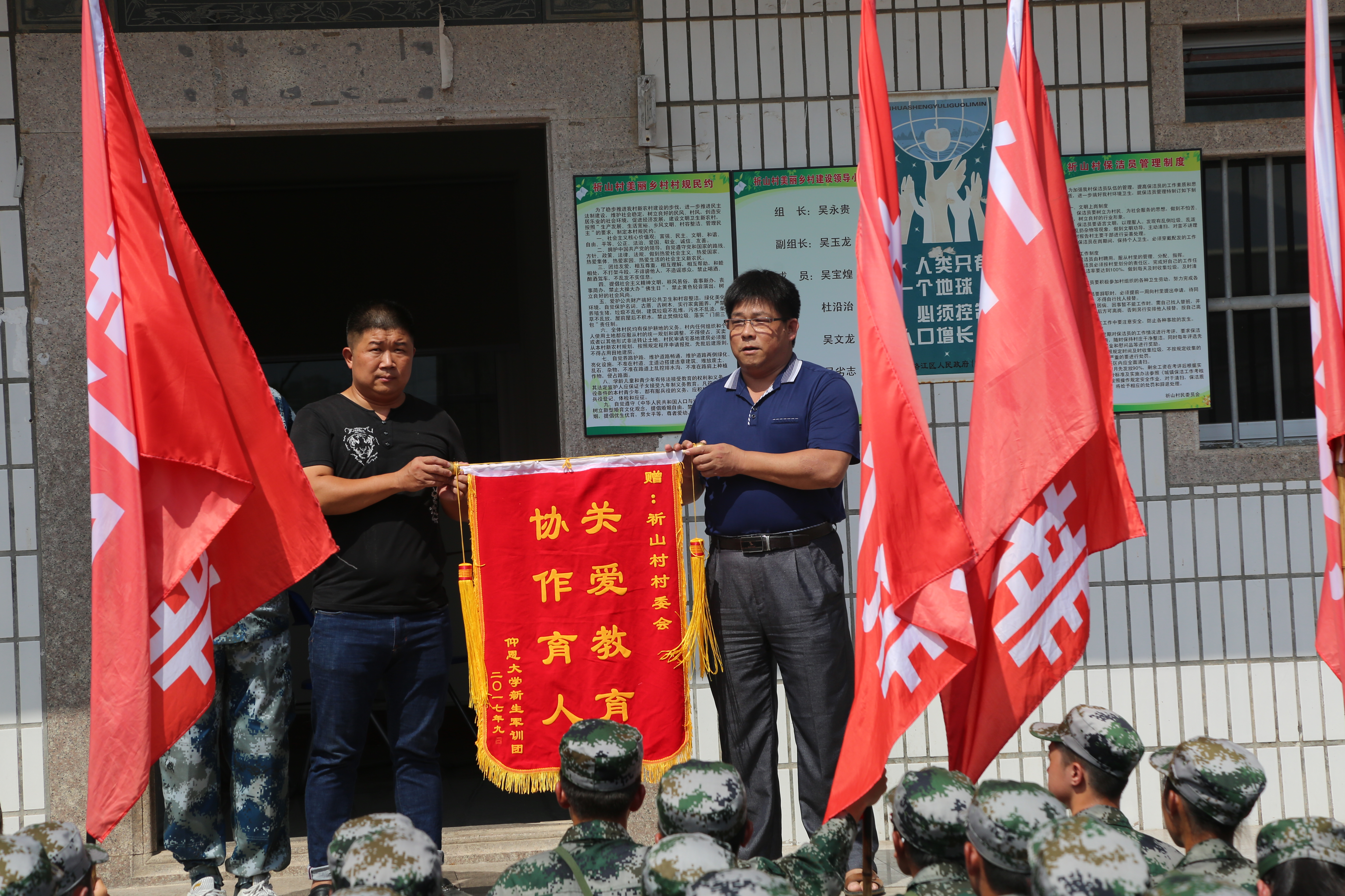 行军拉练过程中,教官为新生们鼓舞士气,组织大家一路高歌,呼喊口号。到达演练区时,新生们听从教官指挥,训练有素地通过了防空演练、染毒地段等规定训练项目,将军训中所学知识运用于实践。在祈山村委会休整期间,祈山村村长吴玉龙对我校师生表示了热烈的欢迎,简要介绍了新农村的建设情况,并提供桶装水为新生们补给能量。薛军楼代表我校新生军训团赠送“关爱教育,协作育人”的旗帜予吴玉龙村长,并对其支持我校行军拉练的工作表示感谢。