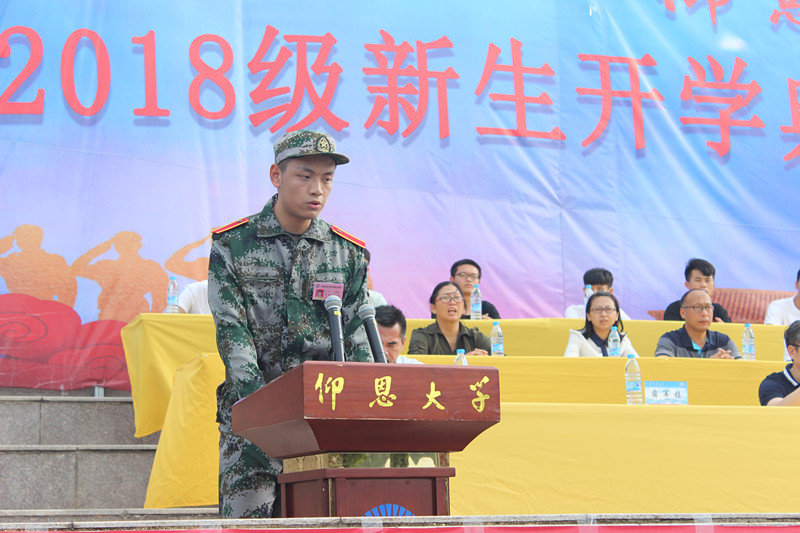 2018级新生代表刘炜鹏在发言中表达了对大学生活的憧憬与成长成才的信心,誓言牢记嘱托使命,立鸿鹄志、练真本领,争做新时代的奋斗者,在军训中秉持校训精神,服从命令,听从指挥,刻苦训练,磨砺意志,以坚韧的姿态全面展示学校形象和仰恩学子的青春风貌。
