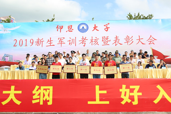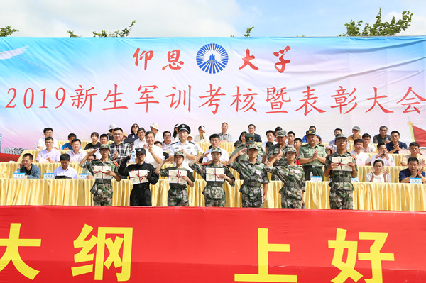 仰恩湖畔,响起铿锵有力的口号;田径场上,踏起坚定不移的步伐。9月30日上午,2019级新生军训考核暨表彰大会在第三教学区田径场举行。泉州军分区战备建设处处长、泉州市学生军训办公室主任秦东初,泉州市公安局党委委员庄文斌,承训部队领导孙辉哲,洛江区人民武装部副部长陈雄钦,中国农业银行股份有限公司泉州分行泉州洛江支行党委书记、行长黄文票,洛江公安分局党委委员、指挥情报中心主任黄奕林,鲤城区人民法院政治部副主任李水品,洛江区妇幼保健所所长、党支部书记李奕林,洛江区教育局林建安,洛江消防大队大队长刘德礼,洛江区医院院长吴海云,马甲镇党委副书记华斌,校党委书记庄哲峰,常务副校长沈毅,校党委副书记程如平,副校长许总、黄小铭,校长助理石羊、鲍莹玉,校企合作代表及新生家长等出席大会。