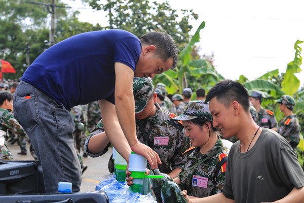 工作人员给师生补给饮用水