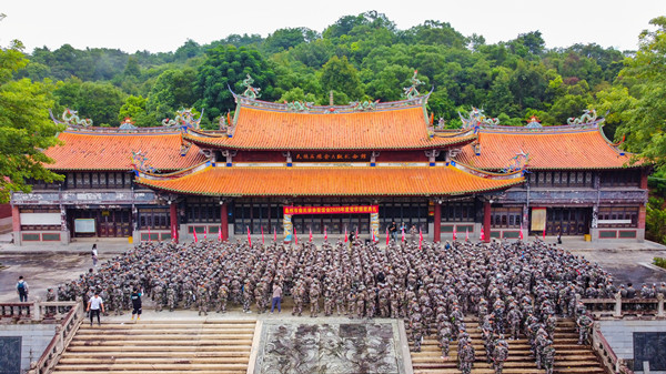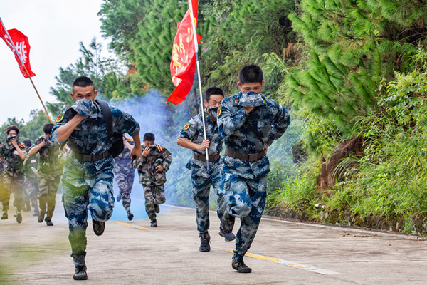 军训拉练途中,同学们以2人纵队为一行进排面,红旗飘扬前方,步伐整齐,秩序井然,山间田野回荡着他们整齐的口号和嘹亮的军歌。为了培养同学们团结协作、勇于克服困难的优良品质和良好的组织纪律性,拉练设置了多个预定训练项目。在项目演练中,新生们听从命令、服从指挥,训练有素地快速通过染毒地段,参观民族英雄俞大猷纪念馆,聆听抗倭名将俞大猷的感人事迹,自觉接受爱国主义教育洗礼。