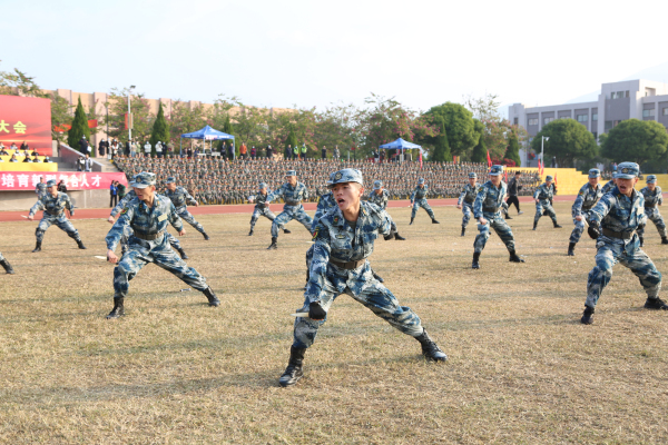 动员大会上,校武装部部长薛军楼宣读了《2021级新生军训实施方案》。承训教官进行敌火下运动、捕俘刀示范演练,展现了过硬的军事素质和良好的精神风貌。