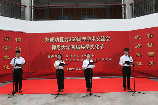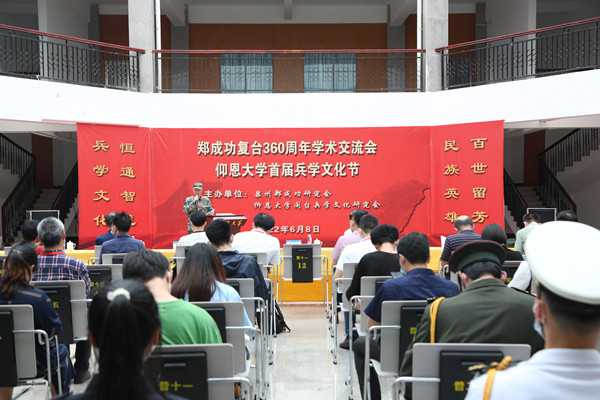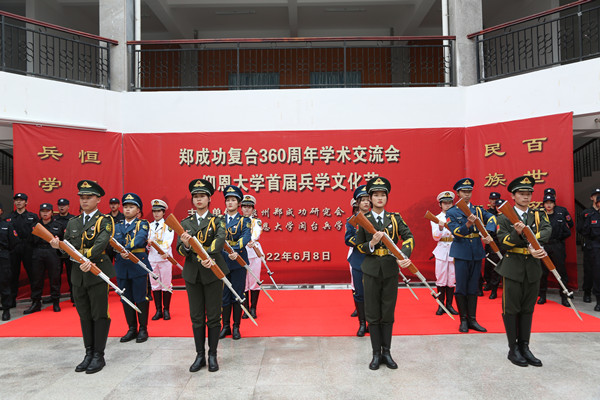 6月8日下午,我校在第三教学区和昌教学楼举行“闽台兵学文化研究会”成立大会暨首届兵学文化节活动。漳州市委原副书记、泉州郑成功研究会会长郑栋梁,泉州市社科联主席李培德,泉州市退役军人事务局局长唐良元,泉州师范学院原副校长林华东,台盟泉州市委专职副主任蒋碧辉,洛江区委宣传部副部长沈诗敬、洛江区人民武装部副部长王震,洛江区退役军人事务局副局长黄永星,惠安县大岞海防民兵哨所书记张亚平,马甲镇武装部副部长杜安枝,yl6809永利集团代理校长许总、党委书记何宏舟、常务副校长魏杨青、党委副书记程如平等出席大会。