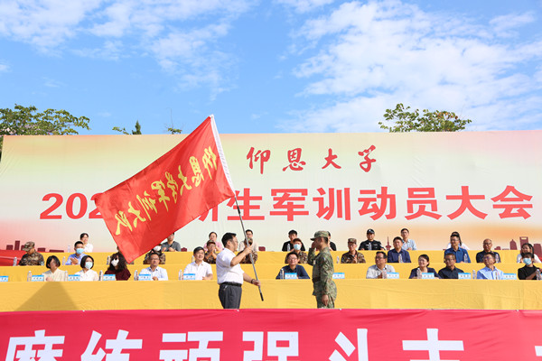 魏杨青为新生军训大会授旗。