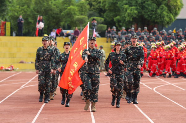 “青春激昂,势如朝阳,不负韶光,护我国防!”踢腿有力,触地有声,军容齐整,斗志昂扬,国旗班方阵、受训新生方阵、雏鹰突发事件应急处置分队方阵、曙光救援队方阵、教工方阵、安保车队等,队伍齐整,口号嘹亮,以饱满的精神状态依次通过主席台接受检阅,向领导嘉宾展现了学校各条战线上师生们昂扬向上的良好精神风貌。