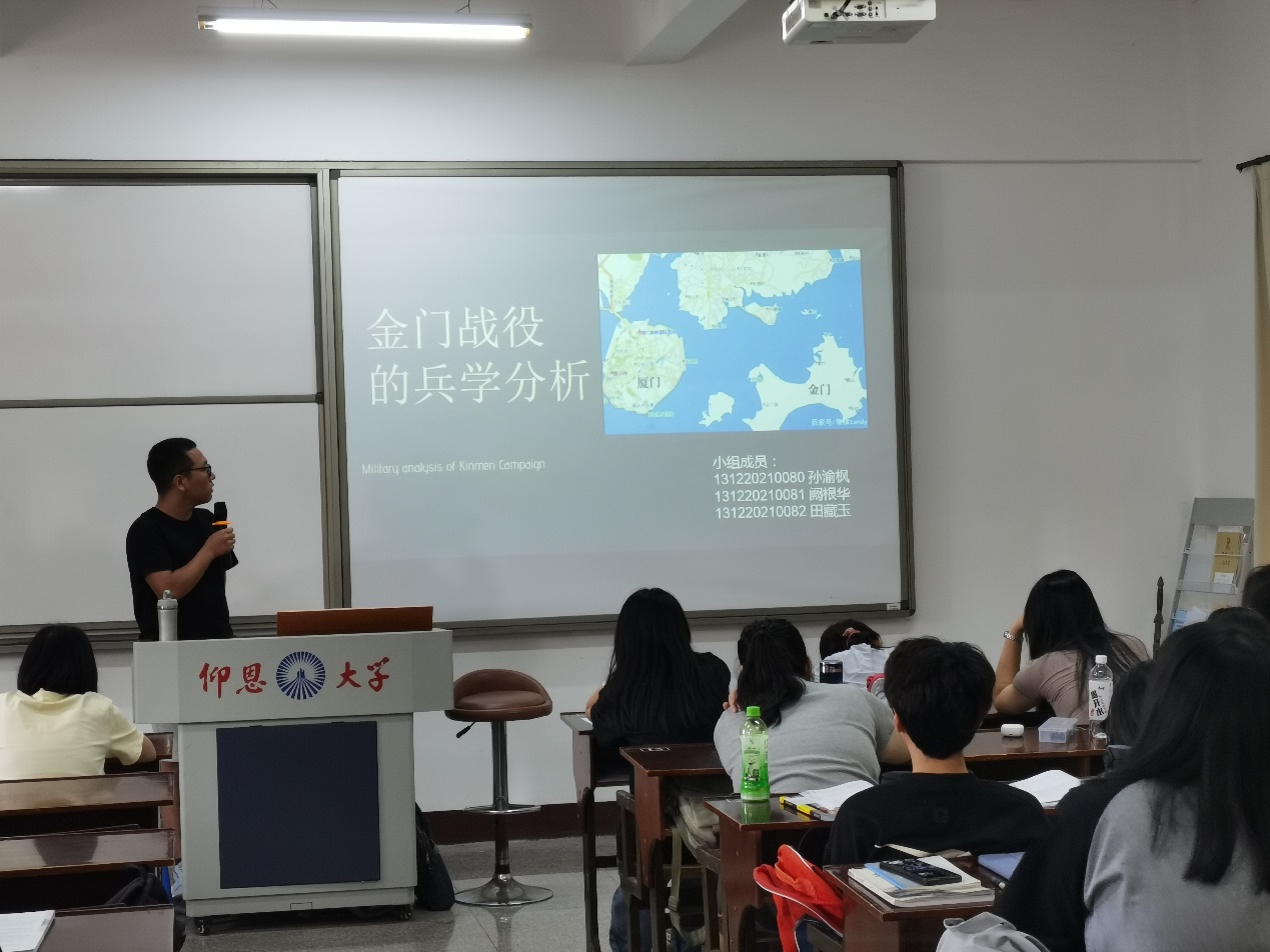 为做好孙子兵法课程改革,促进孙子兵法课程教学与闽台兵学文化研究融合发展,本学期末军事理论教研部充分发挥闽台兵学文化研究会学生会员的带头作用,在孙子兵法课程教学中不断发掘和弘扬本土化兵学文化元素,将每个教学班按照“知胜组”“道胜组”“谋胜组”“先胜组”“全胜组”“易胜组”“攻胜组”“守胜组”等分成几个小组,每个小组5-6人,以闽台地区现有的兵学文化资源,如南安郑成功纪念馆、永春林俊德纪念馆、福州马尾船博物馆等作为调研素材,利用周末时间亲临现场进行实地研学。小组内部提前进行合理分工,有搜集素材、撰写方案,有负责现场讲解、视频录制,也有的代表小组在班级进行分享交流,各尽所能,充分发挥了团队合作的智慧和力量。