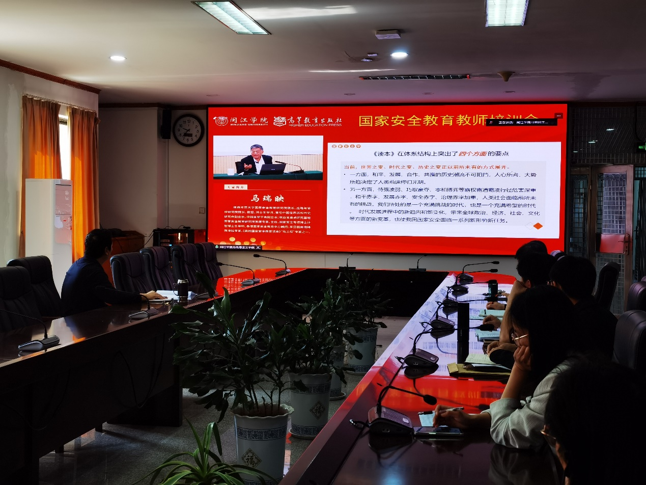 为贯彻落实习近平总书记总体国家安全观和党的二十届三中全会精神,认真落实全国教育大会精神,4月16日上午,我校军事理论教研部和马克思主义学院部分教师参加由福建省教育厅组织的国家安全教育教师培训,此次培训会邀请陕西师范大学国家安全教育研究院院长马瑞映教授作“学深悟透《国家安全教育大学生读本》—暨《国家安全教育大学生读本》”导论“解读、高等教育出版社经管法事业部主任于明对《国家安全教育大学生读本》的内容结构等方面进行了讲解,最后由福建农林大学等学校老师对国家安全教育进行说课分享。